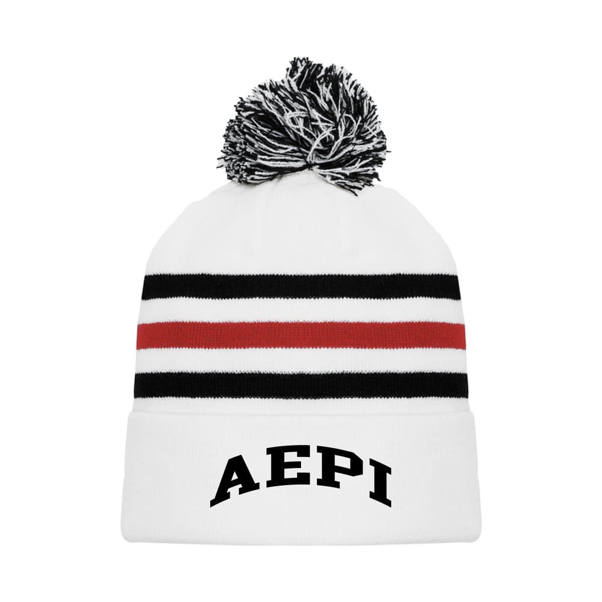 Heads up! We are in LOVE with this clean AEPi white hockey knit beanie. From the super sharp embroidery, to the classic style, Alpha Epsilon Pi icon to make this classic timeless.