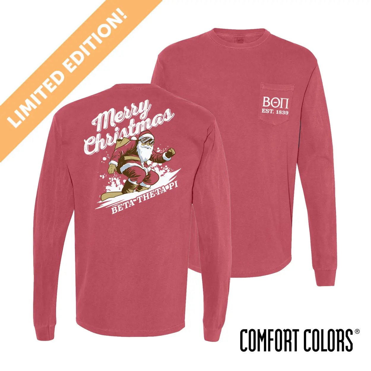Embrace the holiday season with this festive long-sleeve tee! The New Holiday Shredding Santa Long-Sleeve Tee features a design that puts a fun, modern spin on traditional Christmas attire. The back showcases a lively graphic of Santa Claus snowboarding down a slope, with "Merry Christmas" arched above his head. Below, the Beta name is cleverly integrated into the snowy landscape. On the front, Beta ta Pi Greek letters and established year are heat-sealed onto the pocket, allowing brothers to proudly display their organization's legacy.