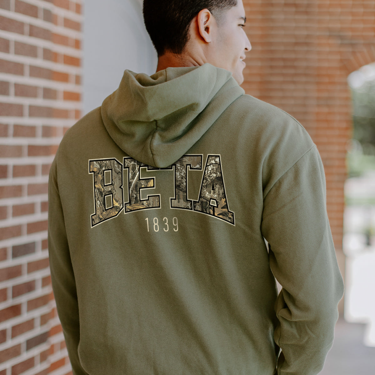 Elevate your chapter pride with our exclusive Beta Tactical Camo Hoodie. Find a bold camo-filled lettering design on the back featuring Beta Theta Pi's legacy since 1839, complemented by subtle branding on the left chest. This hoodie is crafted from a premium cotton-polyester blend for ultimate comfort and durability. The oversized fit, ribbed cuffs, and kangaroo pocket showcase modern style and functionality. Perfect for chapter events, campus life, or casual wear. Available in sizes S-XXXL.