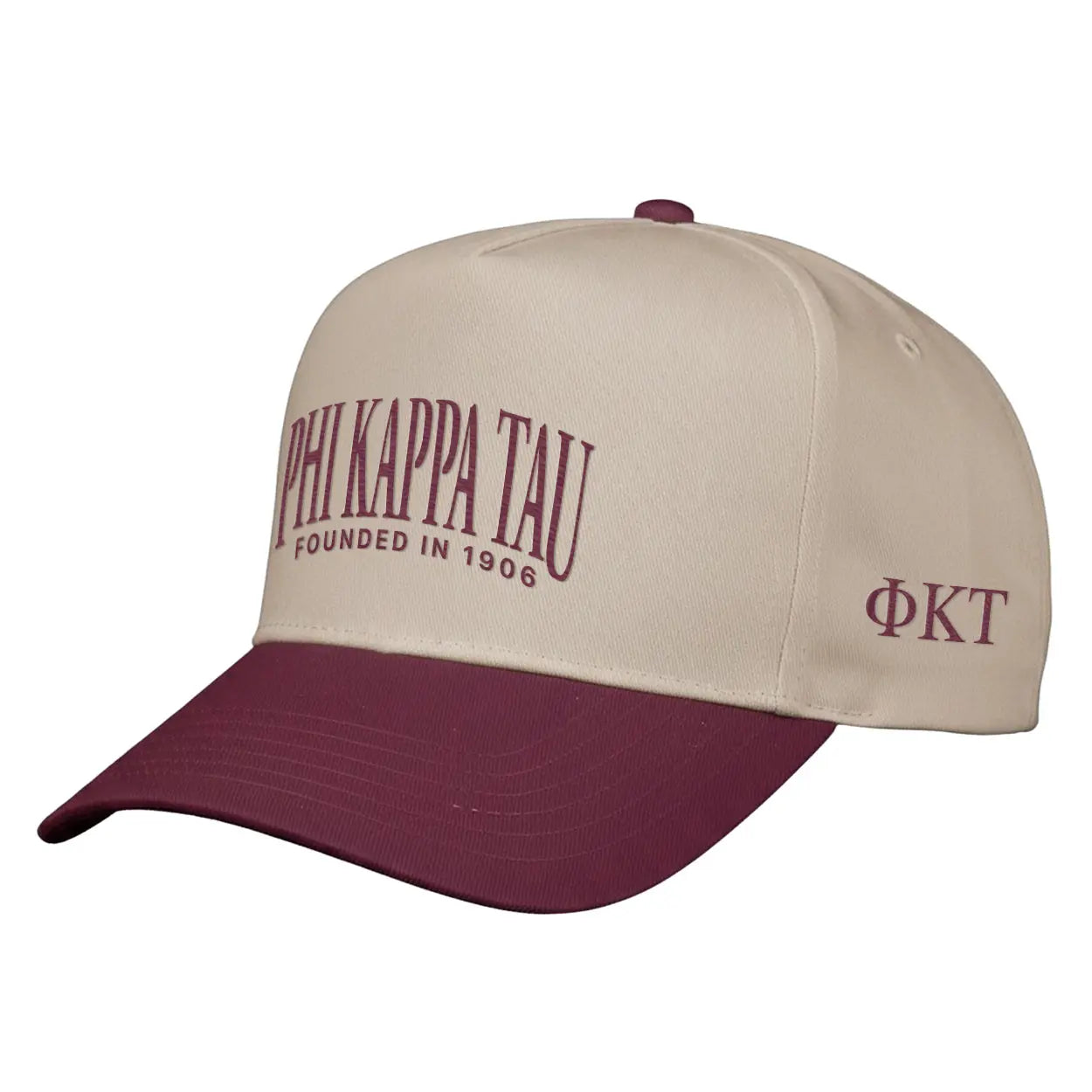 The Phi Tau Two Tone Hat keeps it simple but sharp with a khaki crown and maroon bill. Phi Kappa Tau is front and center in premium embroidery, with an extra embroidered detail on the side that ties the look together. The two-tone design gives it just the right amount of contrast, while the snapback closure makes it adjustable for all-day comfort. Whether it's class, chapter events, or just kicking back, this hat is an easy go-to.