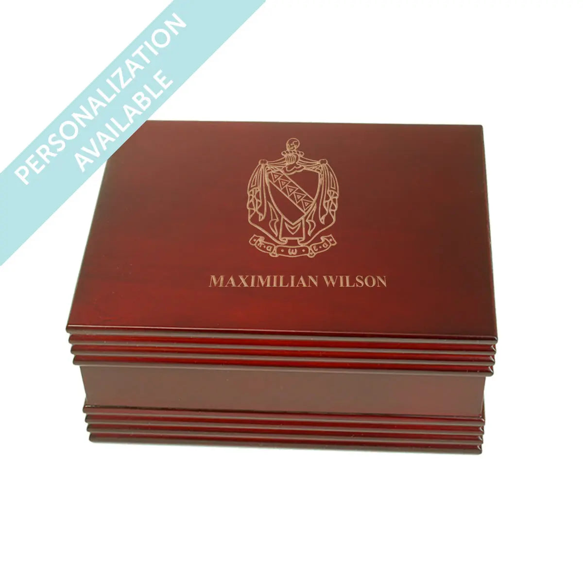This TKE Deluxe Rosewood Box features your fraternity's distinguished crest laser-engraved on its rich, polished rosewood lid. Measuring 7"L _ 5.5"W _ 3"H, this elegant keepsake box is perfect or storing fraternity memorabilia, pins, watches, cufflinks, or other cherished items.