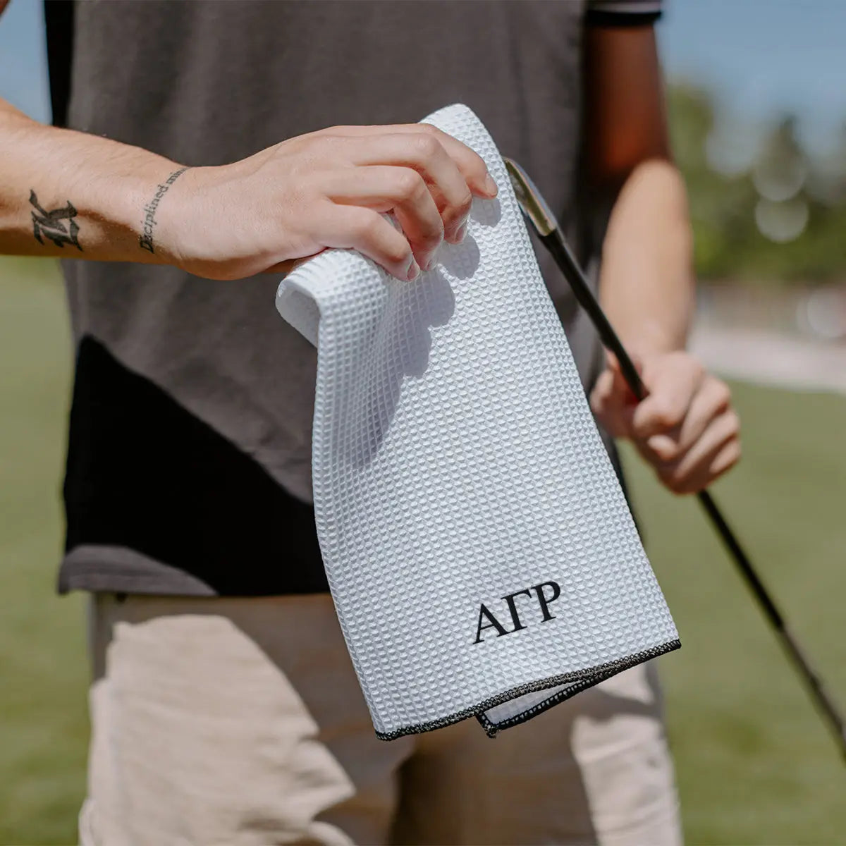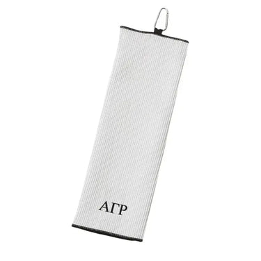 AGRs need only the best and this 85/15 polyester/polyamide waffle-weave microfiber towel should suit every golfers needs. With a contrasting black trim and tri-folded with a silver carabiner at the top for easy toting, this Alpha Gamma Rho embroidered towel is ready to hit the course. This towel is 17 inches wide and long.