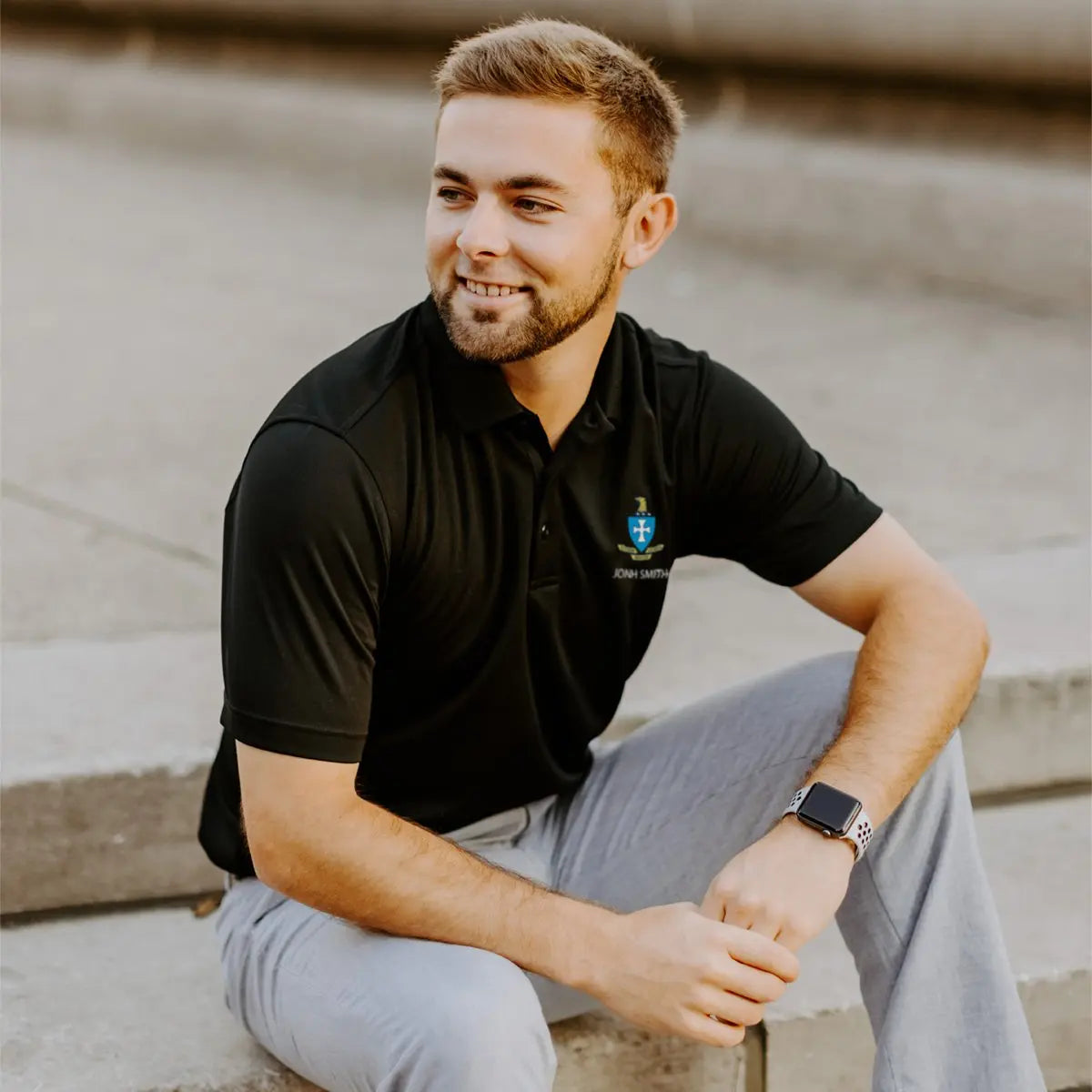 Now you may personalize our black moisture wicking Performace Polo! This AGR polo will keep you protected from the sun with its UPF30 rating. With extra stretch for additional comfort, this polo is great for keeping cool under pressure. Featuring Alpha Gamma Rho's crest on the front, this button-up polo will make you the envy of your AGR brothers!