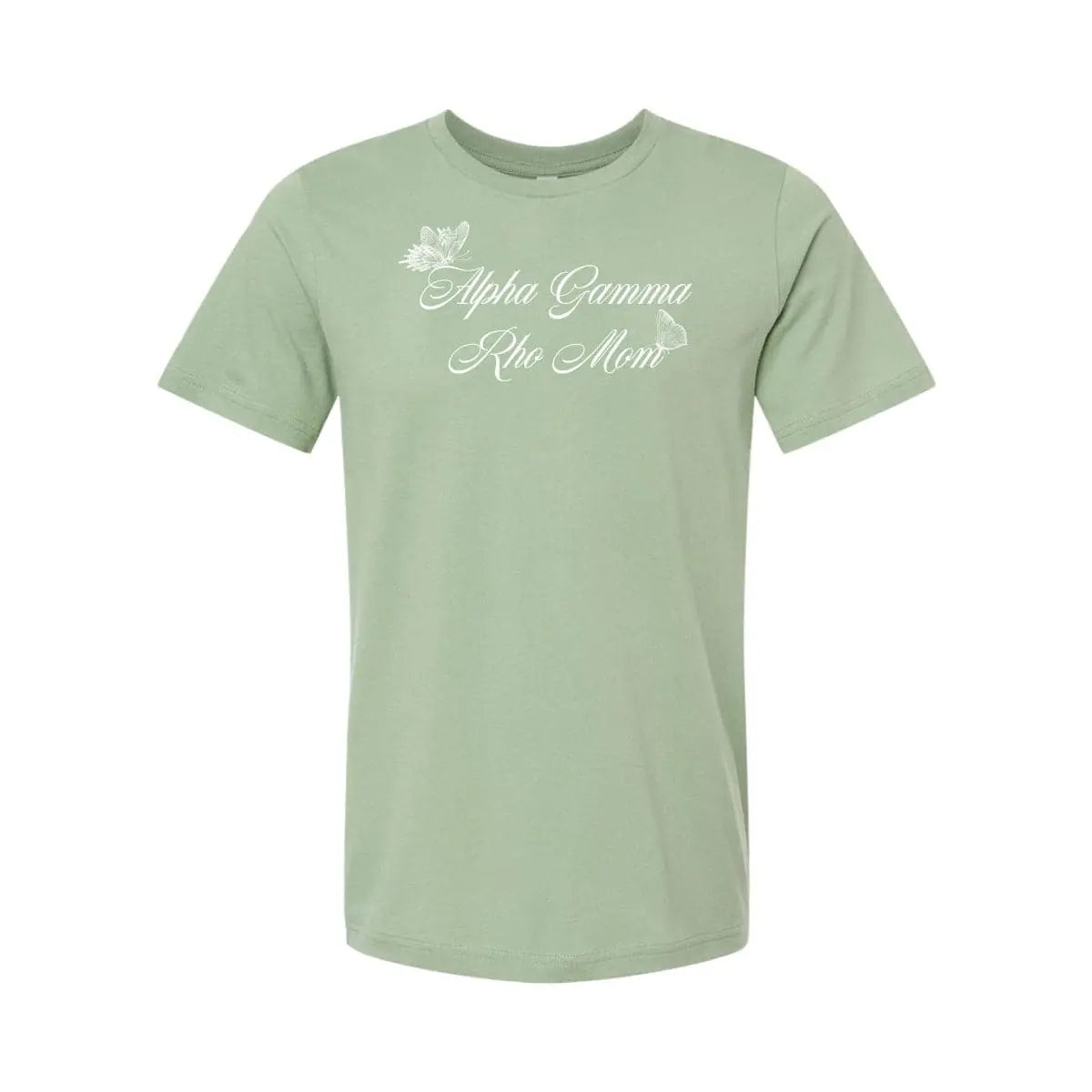 Show your mom some love with a new t-shirt! This sage green tee features "AGR Mom" surrounded by delicate butterflies. Your mom is proud of her Alpha Gamma Rho, let her show the world in this new fraternity mom t-shirt.