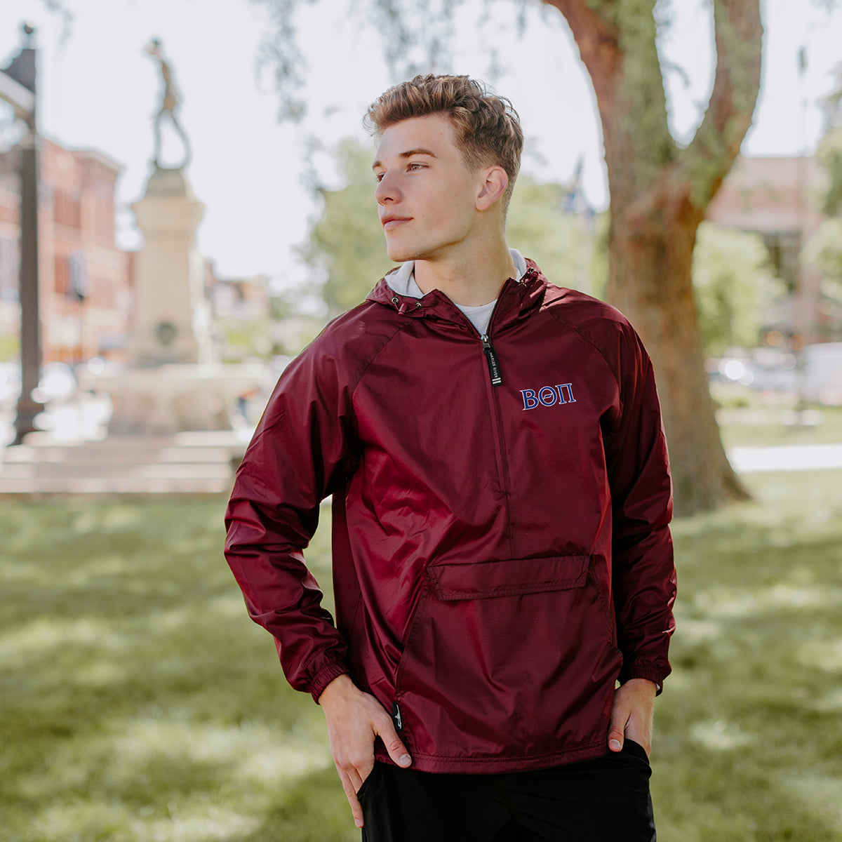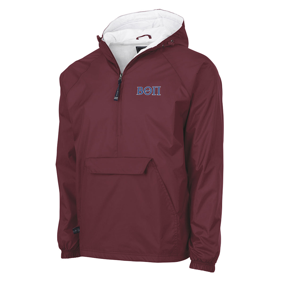 When there's a chill in the air or rain in the forecast, this classic Beta Charles River hooded pullover will not let you down. The wind/water resistant nylon exterior in navy or maroon and 100% soft cotton flannel lining of our anorak windbreaker will keep you cozy while you sport your Beta Theta Pi Greek letters, and it conveniently packs into its own front pocket, making it the perfect companion for travel. Personalization is available on the left chest and is a perfect place for your name, chapter, or event. 20 character maximum. Please, no profanity or school names.