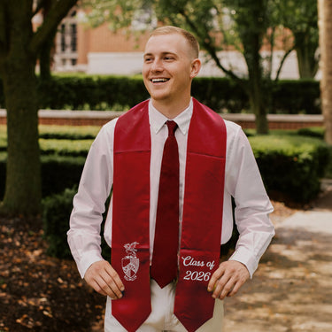 Be graduation ready in this Beta embroidered stole. This traditional and classic design features Beta Theta Pi's crest and colors and graduation year, helping to make that diploma hand off one to remember.