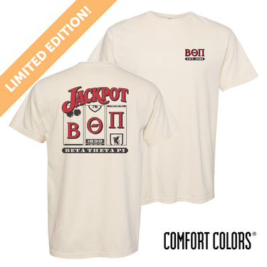 Hit the style jackpot with the Limited Edition Jackpot Tee, a Beta shirt made for brothers who want a standout look. This t-shirt features a bold vintage casino-inspired back graphic with slot symbols and classic Jackpot lettering. Limited edition and exclusive, this Beta Theta Pi tee will not be restocked.