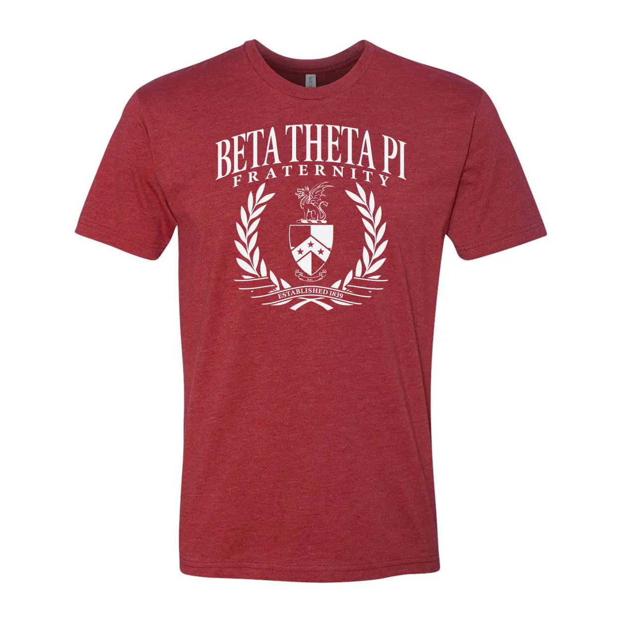 This Beta tee blends a classic collegiate design with modern comfort. Printed on a premium cotton-poly blend tee, it features Beta Theta Pi's official crest framed by bold typography and traditional laurel elements. The fabric is ultra-soft and breathable with a modern, athletic fit. Whether you're headed to a chapter event or just hanging out, this tee is an easy go-to.