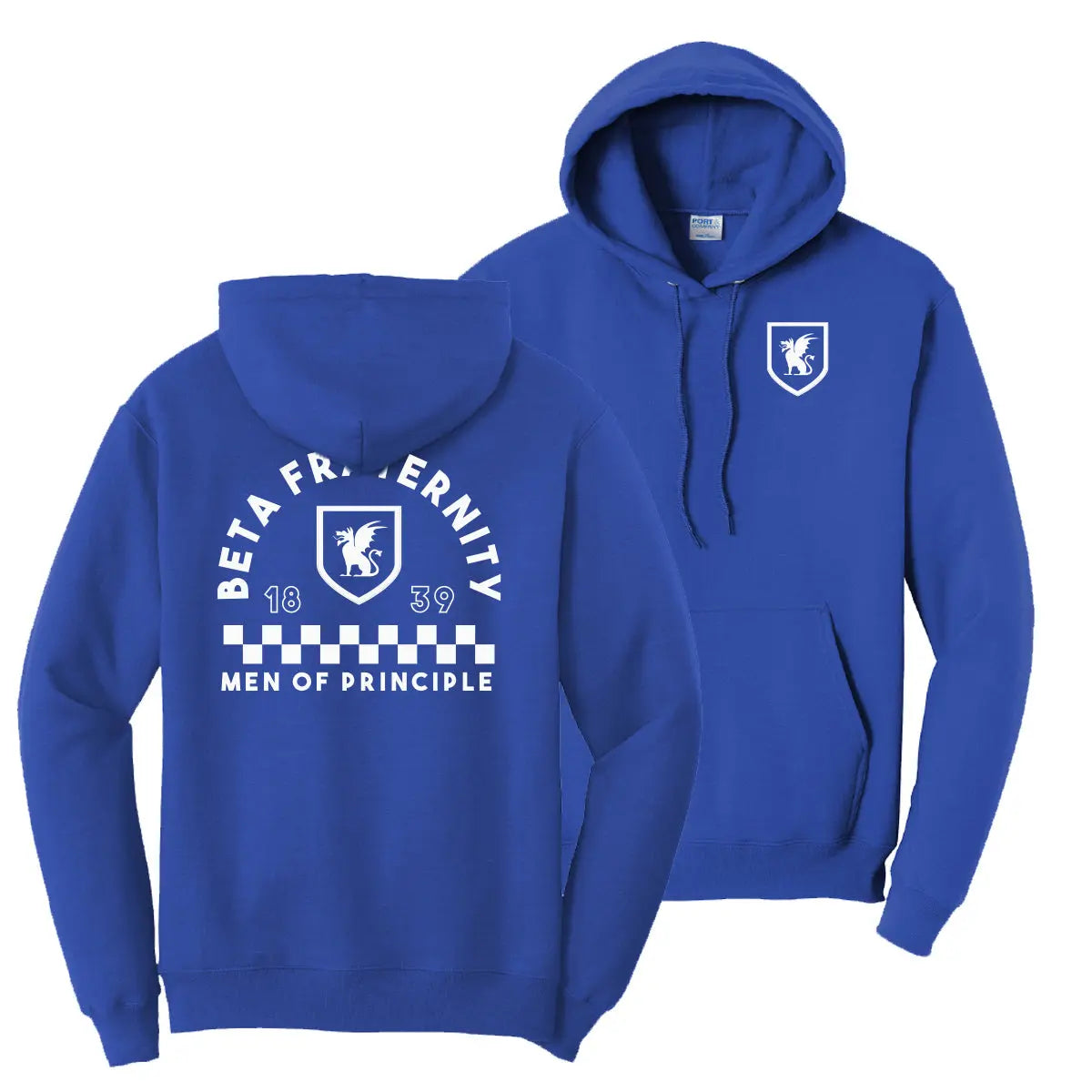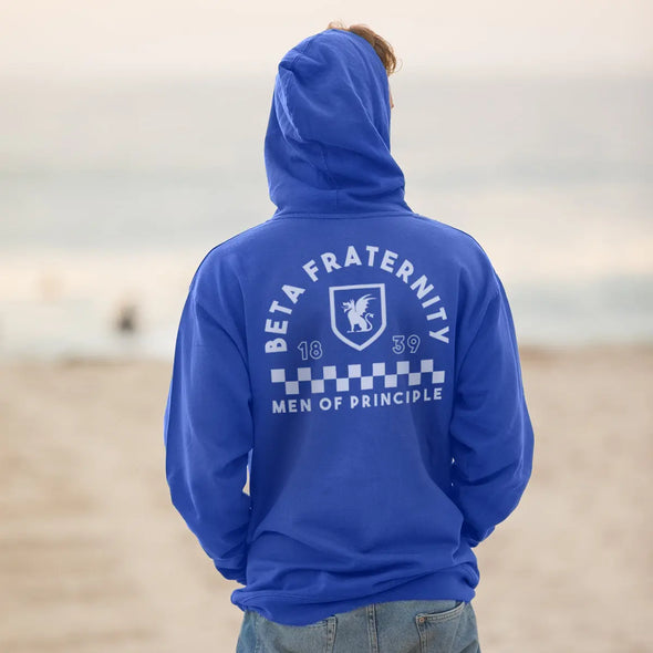Look stylish while representing your Beta fraternity with this retro-inspired graphic hoodie. This midweight sweatshirt has a bold design on the back that features the Beta Theta Pi symbol and motto.