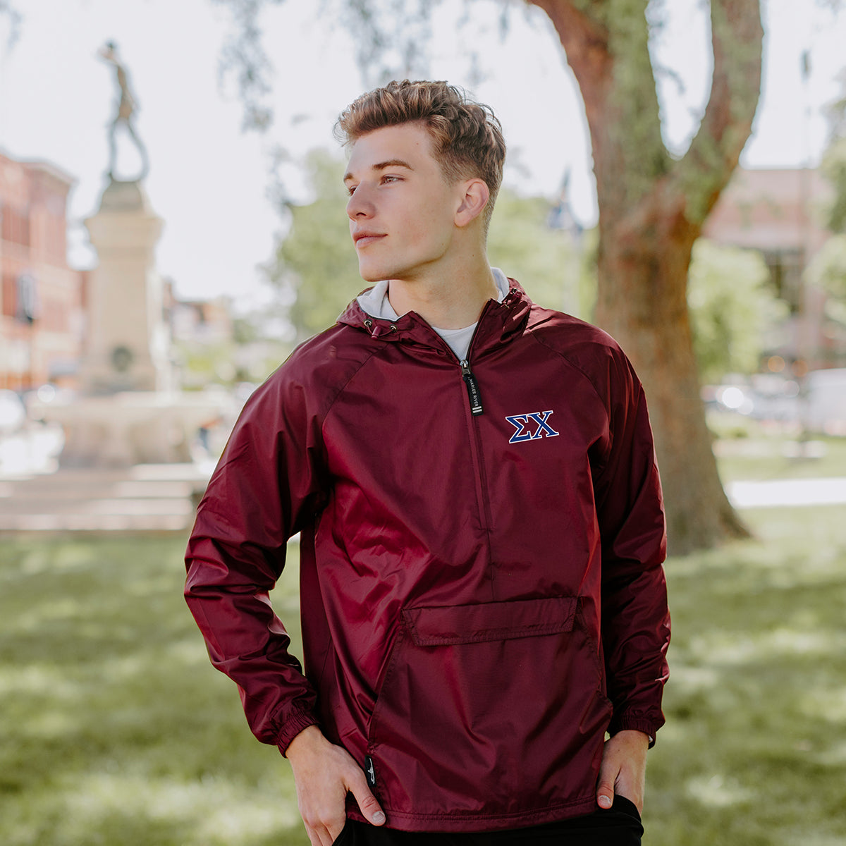 When there's a chill in the air or rain in the forecast, this classic Charles River hooded pullover will not let you down. The wind/water resistant nylon exterior in navy or maroon and 100% soft cotton flannel lining of our anorak windbreaker will keep you cozy while you sport your Greek letters, and it conveniently packs into its own front pocket, making it the perfect companion for travel. Personalization is available on the left chest and is a perfect place for your name, chapter, or event. 20 character maximum. Please, no profanity or school names.