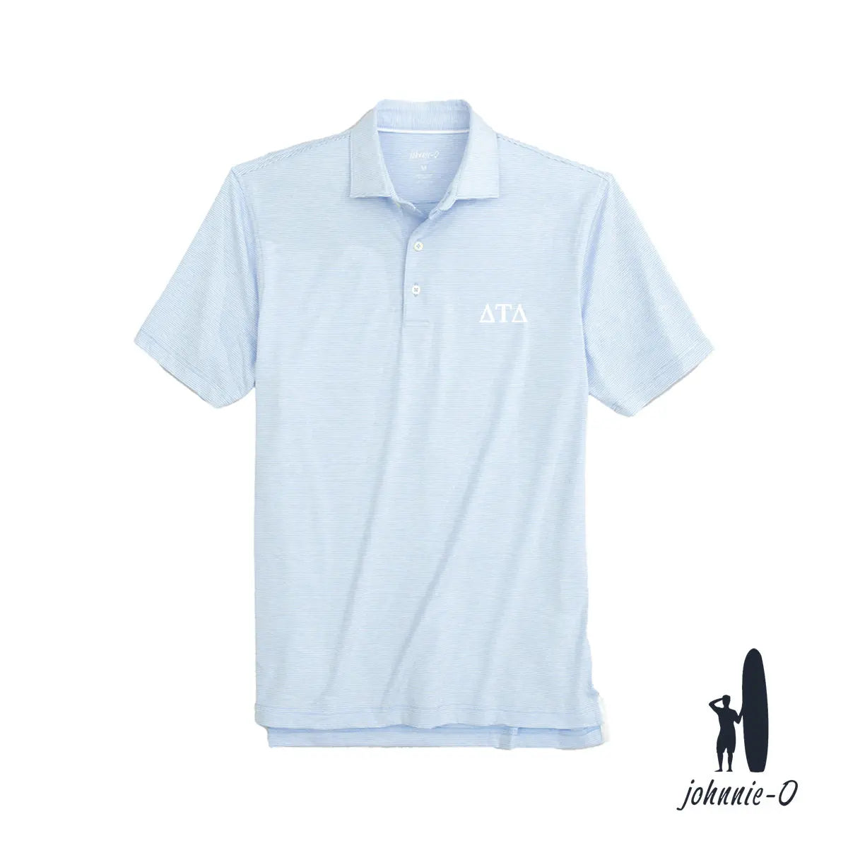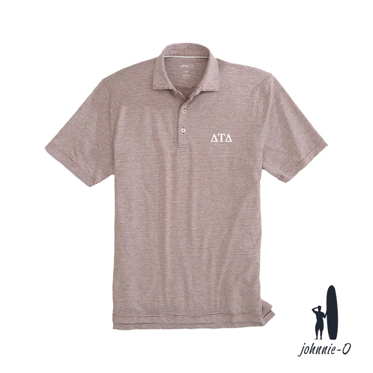 Introducing the new Johnnie-O striped polo, available in maroon or blue. This stylish shirt features a classic striped design and showcases your Delt pride with white embroidered letters on the left chest. Combining Johnnie-O's renowned quality with collegiate flair, this polo is perfect for campus events or casual wear. Available in two colors, this polo effortlessly blends comfort, style, and Delta Tau Delta spirit.