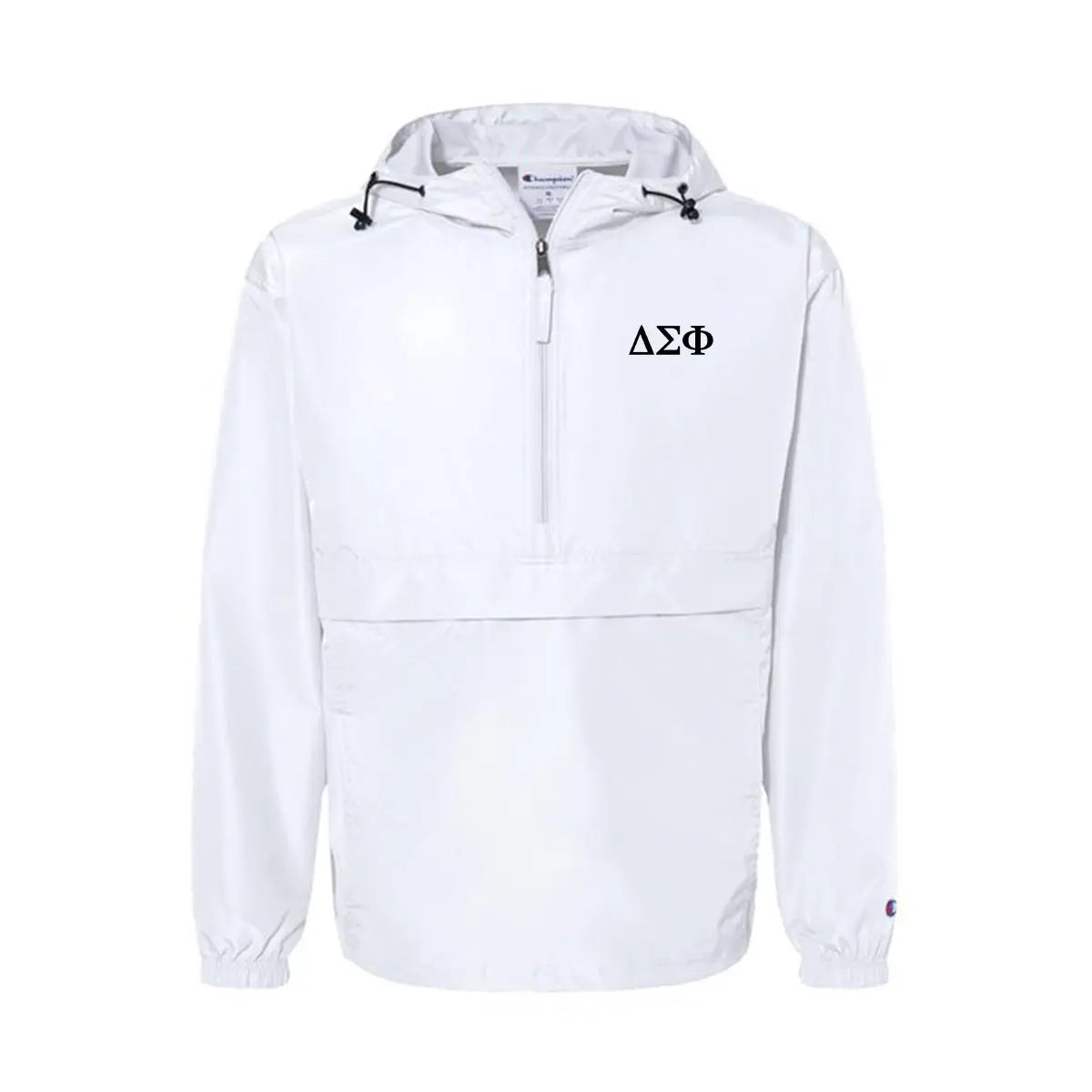 This Delta Sig windbreaker is sleek and durable to last you through your college days! Whether you're caught in the rain on campus or celebrating a windy win for your school this wind and water-resistant jacket is all you'll need. This windbreaker comes with subtle Delta Sigma Phi Greek letters on the left chest with your choice of a black or white jacket.