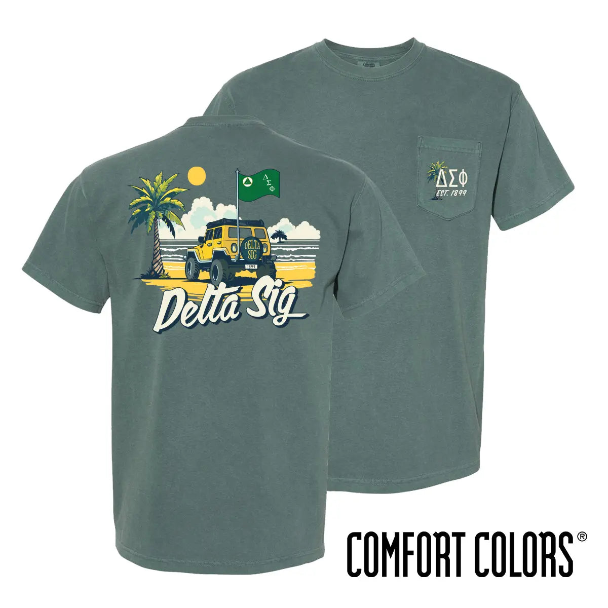 Hit the beach in style with our newest design featuring a laid-back coastal vibe that perfectly captures the adventurous spirit of Delta Sigma Phi tee. This eye-catching graphic showcases a classic Jeep cruising along pristine sandy shores, proudly displaying the Delta Sig flag flying high in the ocean breeze. Whether you're heading to meetings, class, or the coast itself, this tee lets you showcase your fraternity pride with a fresh design that's sure to turn heads.