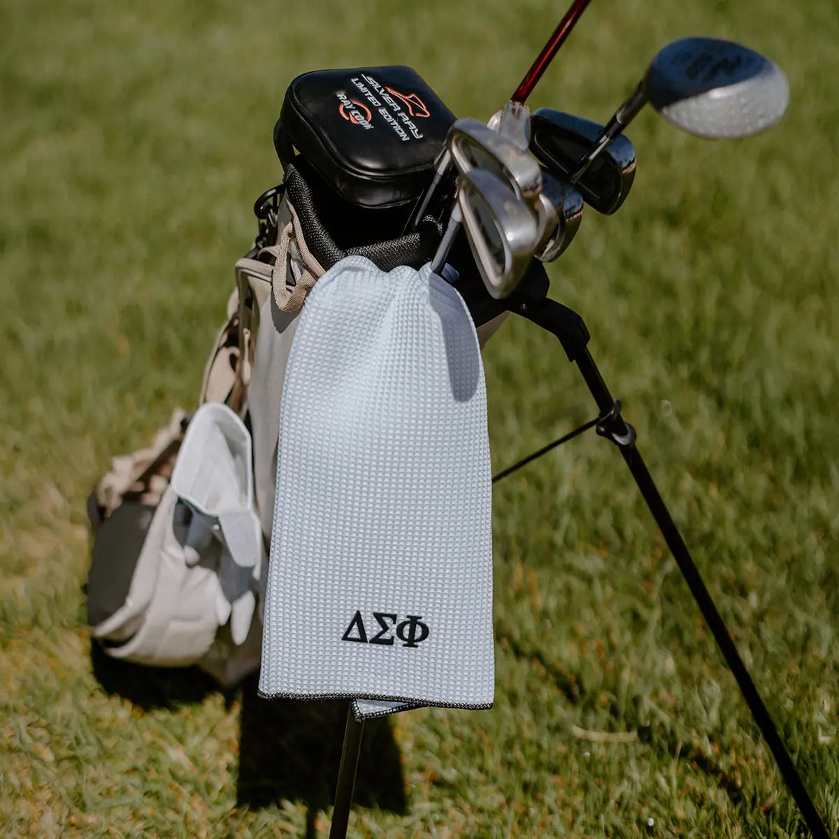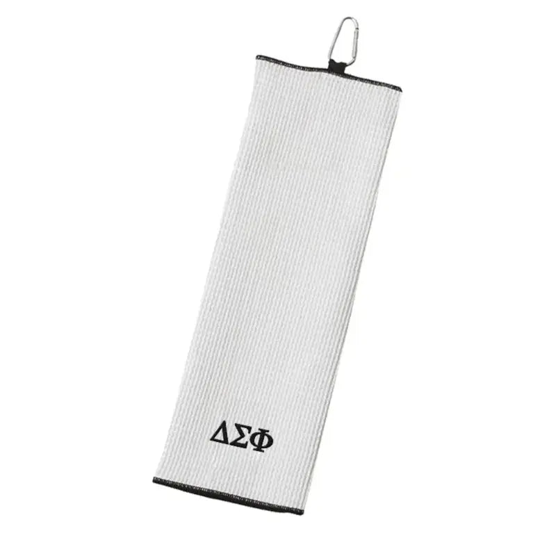 Delta Sigs need only the best and this 85/15 polyester/polyamide waffle-weave microfiber towel should suit every golfers needs. With a contrasting black trim and tri-folded with a silver carabiner at the top for easy toting, this Delta Sigma Phi embroidered towel is ready to hit the course. This towel is 17 inches wide and long.