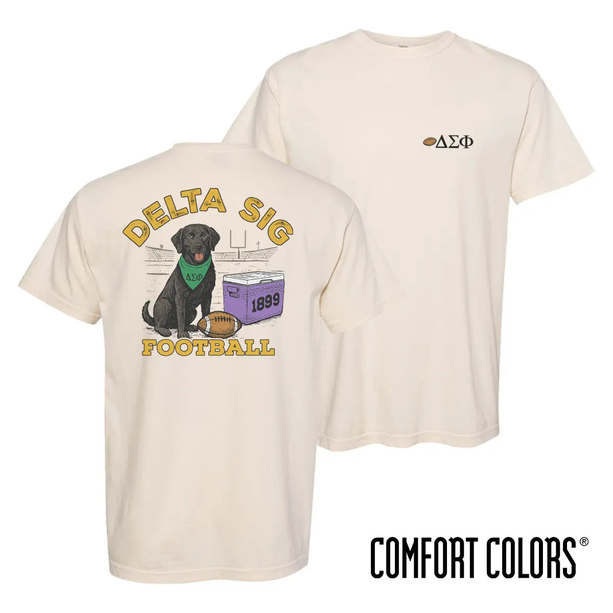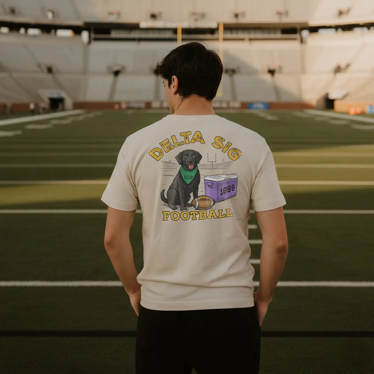 The Linebacker Lab Short Sleeve Tee is a playful nod to tradition, tailor-made for Delta Sig. Front and center, a game-day-ready black lab decked out in a for recruitment, this Delta Sigma Phi bandana sits proudly in front of the goalposts, guarding a classic cooler stamped with your founding year and a well-worn football by its side. The hand-drawn artwork brings a nostalgic, vintage-inspired feel capturing the energy of fall Saturdays and brotherhood pride. Whether you're repping your fraternity on campus, at homecoming, or just around town, this tee brings together timeless style and fraternity spirit in one standout piece.