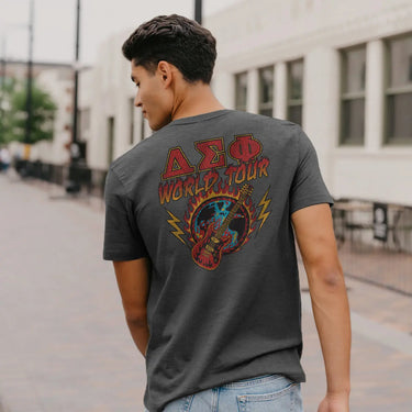 The World Tour tee brings high-energy style with a vintage rock-inspired design, perfect for anyone proud to represent Delta Sigma Phi. With bold Delta Sig letters on the front and a fiery graphic on the back, it's built for chapter events, game days, and everyday wear. Rep your brotherhood in a tee that blends personality and pride into one standout look.