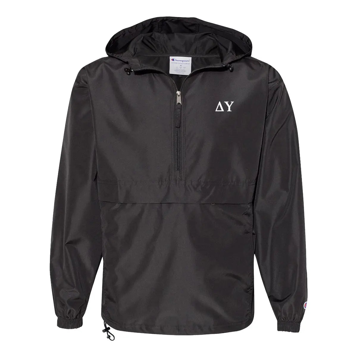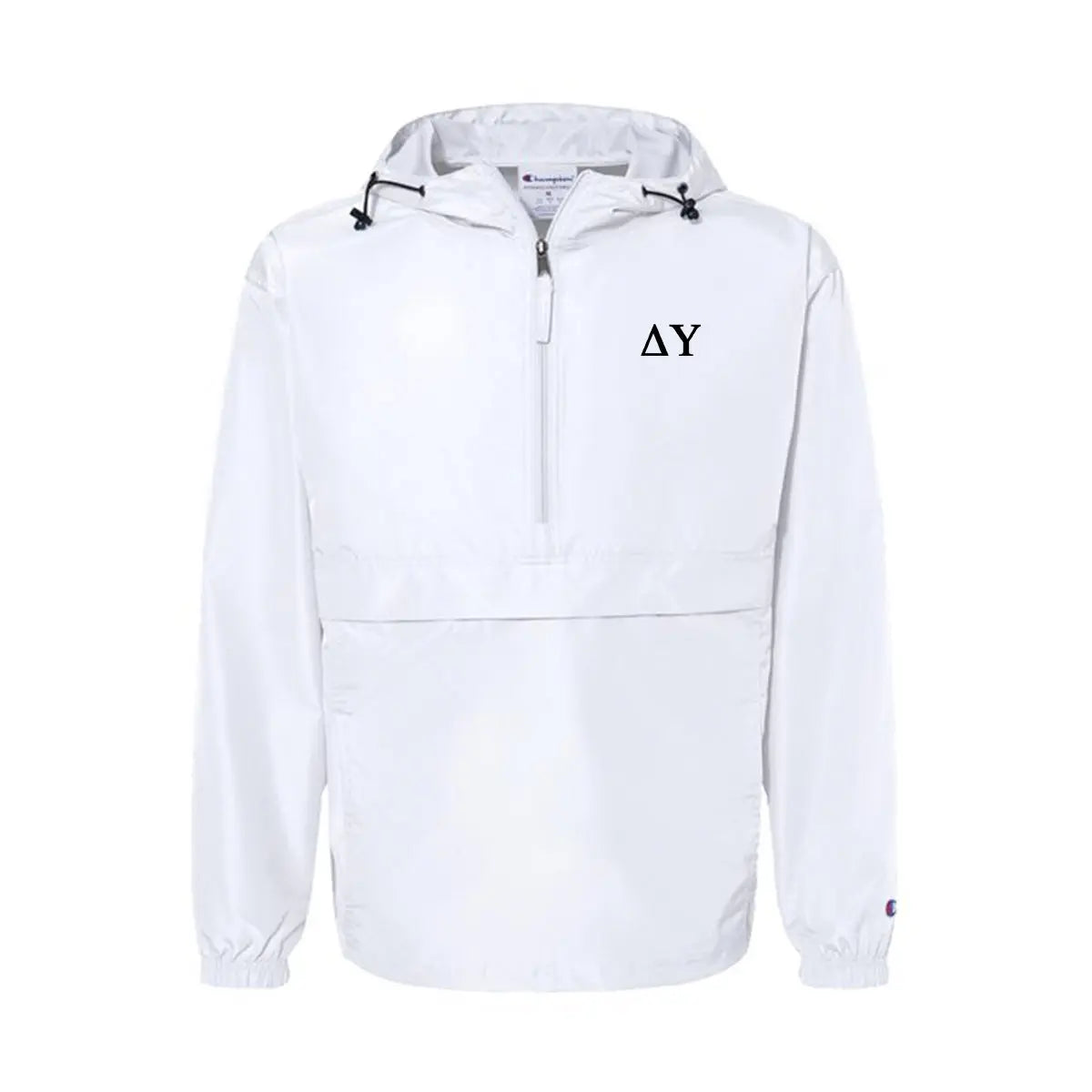 This DU windbreaker is sleek and durable to last you through your college days! Whether you're caught in the rain on campus or celebrating a windy win for your school this wind and water-resistant jacket is all you'll need. This windbreaker comes with subtle Delta Upsilon Greek letters on the left chest with your choice of a black or white jacket.
