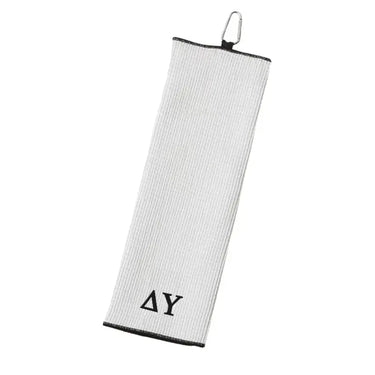 Delta Upsilons need only the best and this 85/15 polyester/polyamide waffle-weave microfiber towel should suit every golfers needs. With a contrasting black trim and tri-folded with a silver carabiner at the top for easy toting, this Delta Upsilon embroidered towel is ready to hit the course. This towel is 17 inches wide and long.