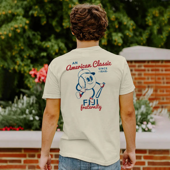 This FIJI Comfort Colors American Classic Short Sleeve Tee is a classic with its combination of style and comfort. Featuring a retro baseball character on the back, this premium Comfort Colors tee will be the comfiest t-shirt in your wardrobe. Enjoy a timeless look with this classic Phi Gamma Delta tee!