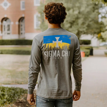 Represent your fraternity with pride with this dark gray Comfort Colors long sleeve pocket tee. Designed with your fraternity flag and Greek letters, this t-shirt is pre-shrunk and made of 100% ring spun cotton.