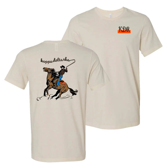 Giddy up! This fun Western inspired tee will surely have any KDR yelling YeeHaw! On the back of this neutral colored tee is a cowboy showing off his lasso skills by spelling out Kappa Delta Rho with a matching front chest. This Western Tee is fraternity favorite!
