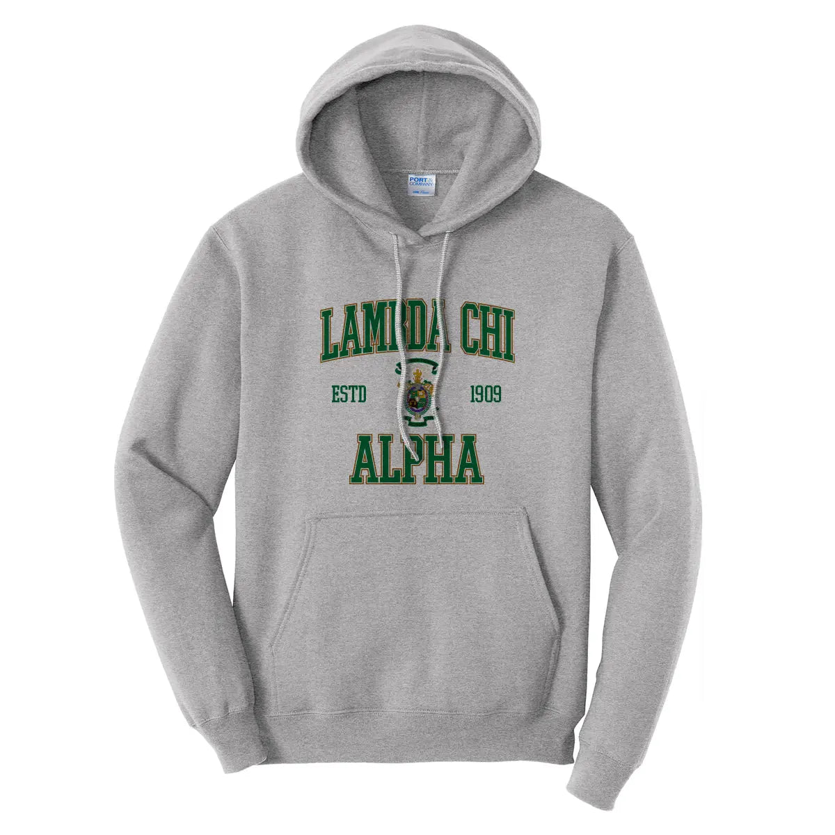 Lambda Chi is a classic and this hoodie with their crest and colors will be also. Lambda Chi Alpha, their crest, and established date is printed on the front of this 50/50 cotton/poly mid-weight hoodie.