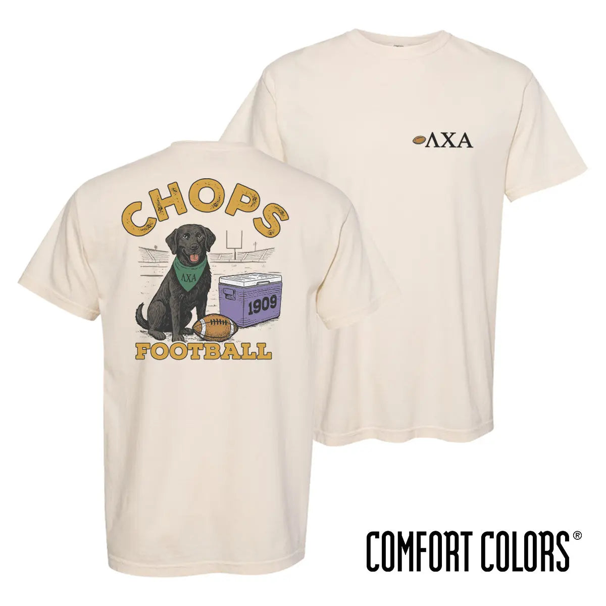 The Linebacker Lab Short Sleeve Tee is a playful nod to tradition, tailor-made for Lambda Chi. Front and center, a game-day-ready black lab decked out in a for recruitment, this Lambda Chi Alpha bandana sits proudly in front of the goalposts, guarding a classic cooler stamped with your founding year and a well-worn football by its side. The hand-drawn artwork brings a nostalgic, vintage-inspired feel, capturing the energy of fall Saturdays and brotherhood pride. Whether you're repping your fraternity on campus, at homecoming, or just around town, this tee brings together timeless style and fraternity spirit in one standout piece.