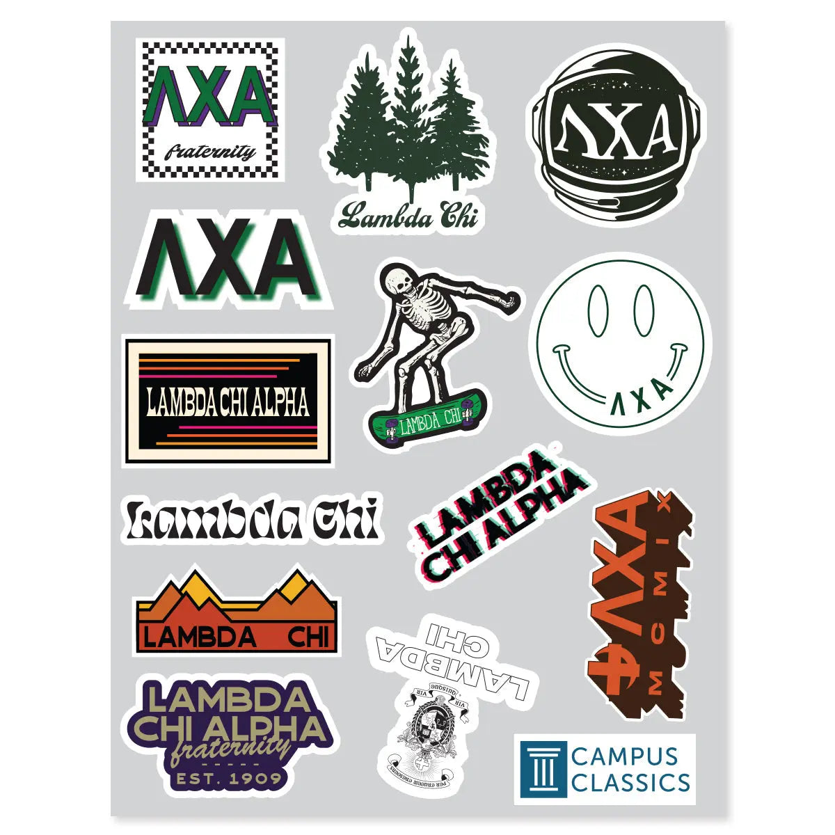 Stickers are what every Lambda Chi needs. To decorate laptops to water bottles, phone cases to mirrors, and everything in between. Lambda Chi pride will show strong with these retro stickers, conveniently all on a full sheet! All stickers are Lambda Chi Alpha with a retro theme!