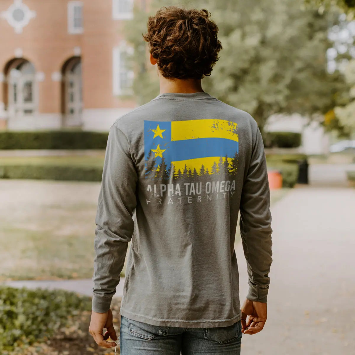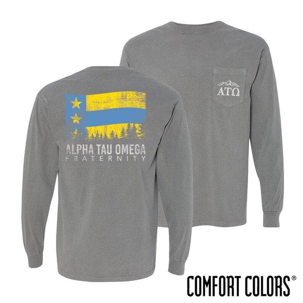 Represent your ATO fraternity with pride with this dark gray Comfort Colors long sleeve pocket tee. Designed with the Alpha Tau Omega fraternity flag and their Greek letters, this t-shirt is pre-shrunk and made of 100% ring spun cotton.