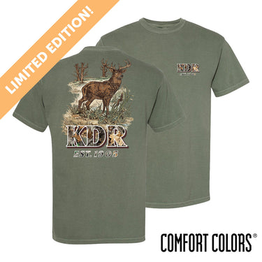 Stand strong in the Limited Edition Woodland Camo Tee. Built for bold KDR style and designed for men who take pride in their letters, this standout piece blends rugged outdoor grit with timeless brotherhood presence. Featuring a detailed woodland scene framed by towering trees and a striking buck centerpiece, the graphic makes a statement without overdoing it, bringing serious character to any chapter lineup while representing the strength and tradition of Kappa Delta Rho.