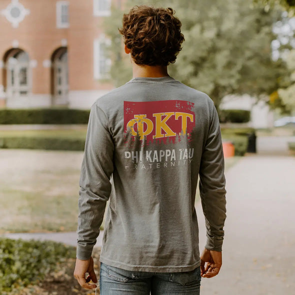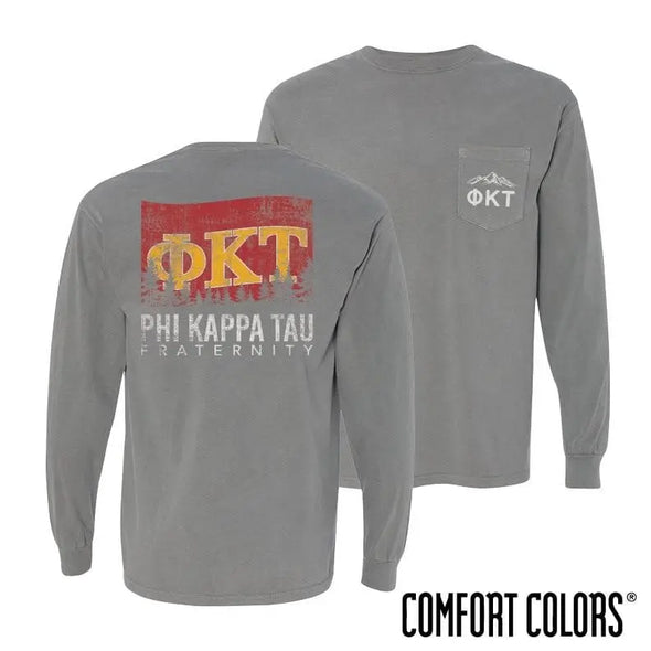 Represent your Phi Tau fraternity with pride with this dark gray Comfort Colors long sleeve pocket tee. Designed with the Phi Kappa Tau fraternity flag and their Greek letters, this t-shirt is pre-shrunk and made of 100% ring spun cotton.