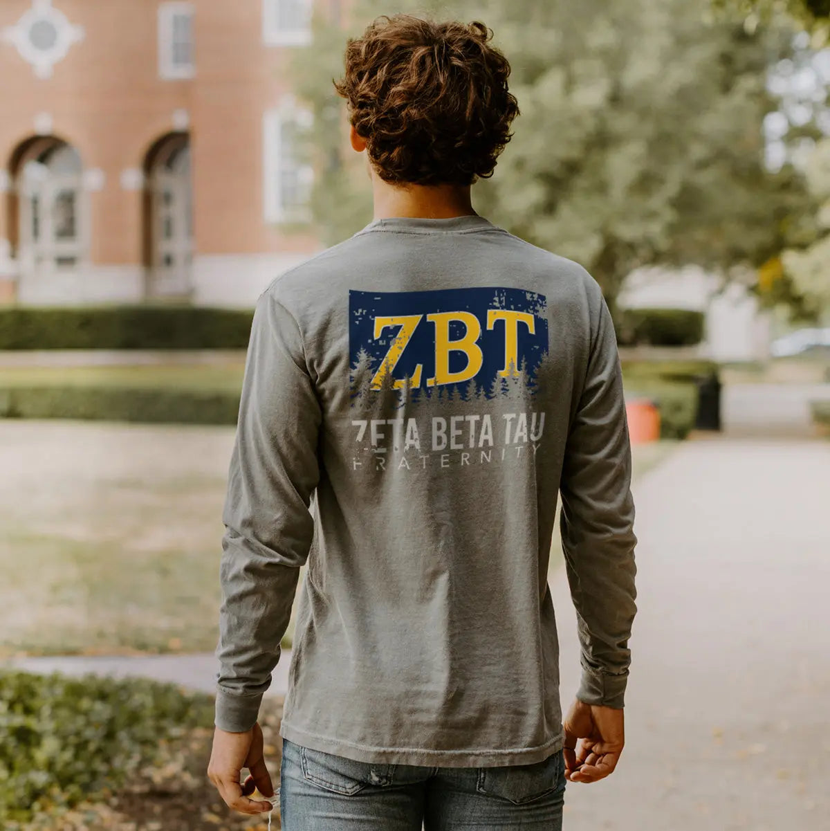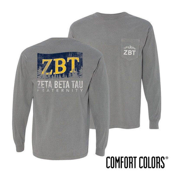 Represent your ZBT fraternity with pride with this dark gray Comfort Colors long sleeve pocket tee. Designed with the Zeta Beta Tau fraternity flag and their Greek letters, this t-shirt is pre-shrunk and made of 100% ring spun cotton.