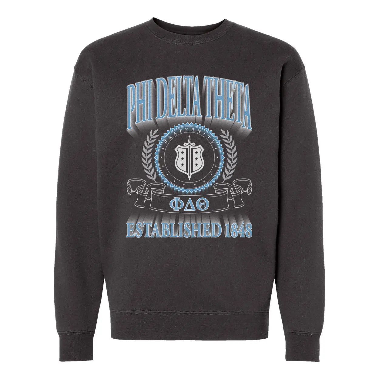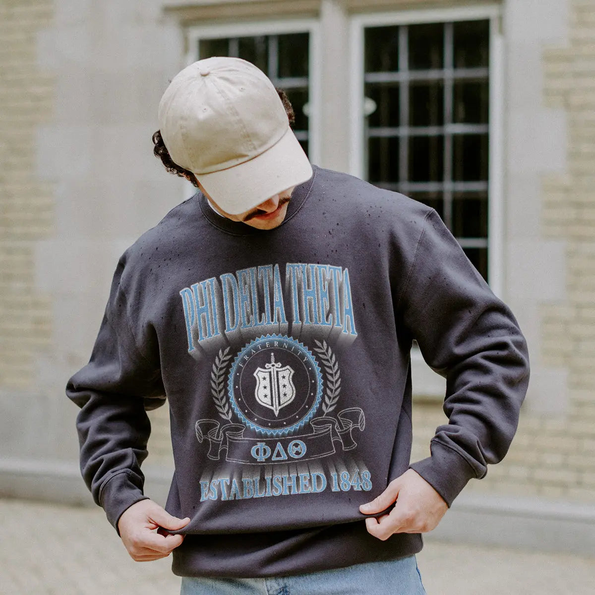 Make a bold statement with the Phi Delt Heavyweight Graphic Crewneck, inspired by classic large-print athletic apparel. Crafted from a durable 10 oz cotton-poly blend, this sweatshirt delivers a true heavyweight feel that is thick, warm, and built to last. The front features bold Phi Delta Theta lettering tied into a vintage collegiate design that stands out. With its sturdy construction and soft interior, this crewneck is perfect for showcasing fraternity pride in comfort and style.