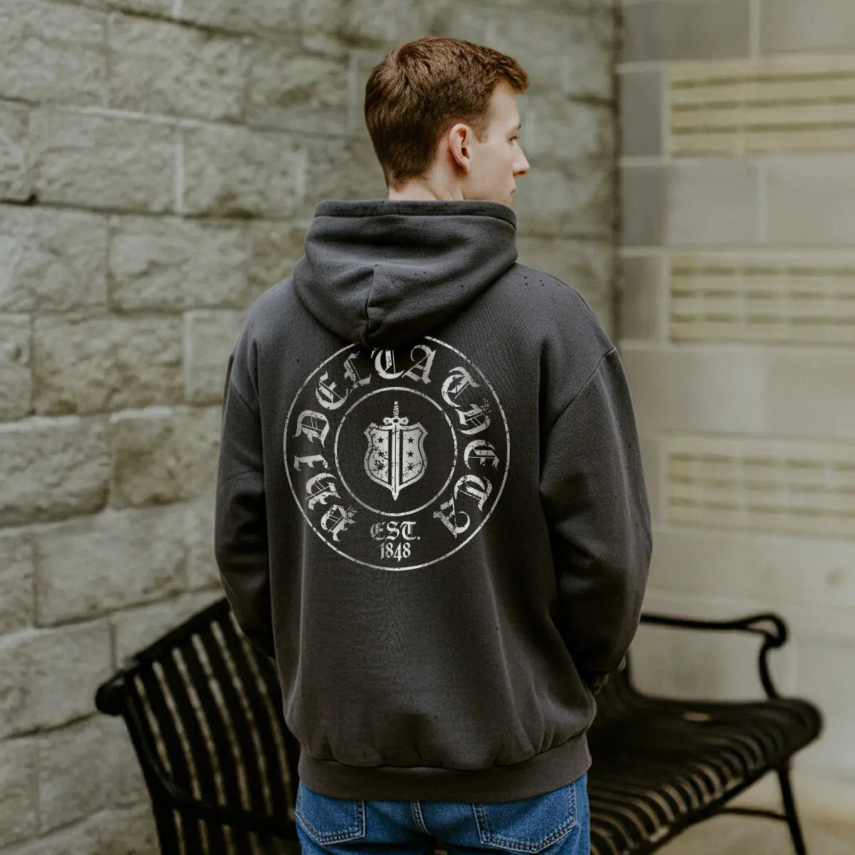Stand strong with the Phi Delt Iron Brotherhood Heavyweight Hoodie. Built for bold fraternity style and inspired by high-end streetwear with a gothic edge, this 10oz hoodie delivers serious weight and serious style. Made from ultra-comfortable heavyweight fleece and designed without a drawstring for a modern, streamlined look, it's perfect for post-chapter hangs, game days, or late-night runs to the Phi Delta Theta house. Whether you're layering up or making a statement, the Iron Brotherhood Hoodie brings fraternity pride into the streetwear spotlight.