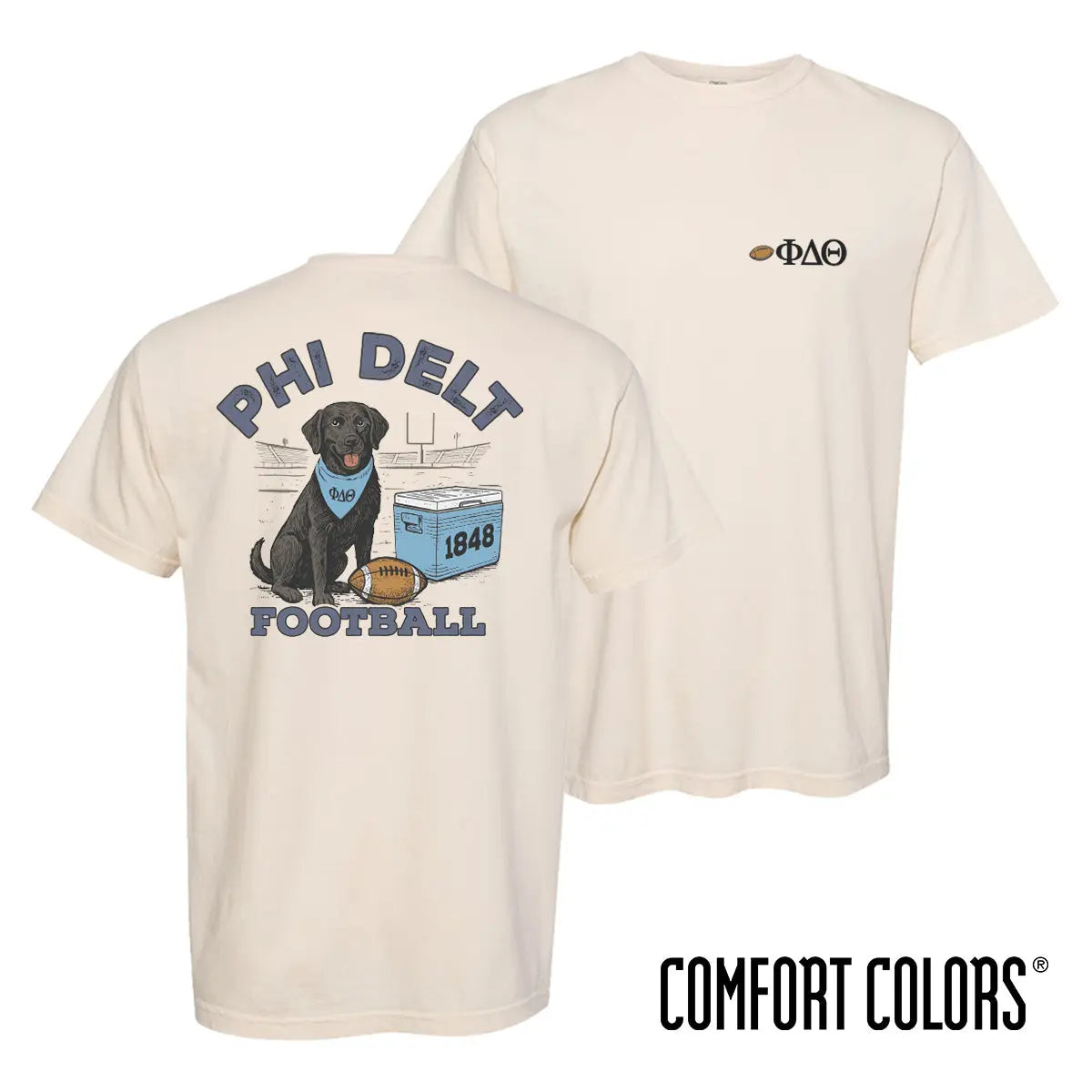 The Linebacker Lab Short Sleeve Tee is a playful nod to tradition, tailor-made for Phi Delt. Front and center, a game-day-ready black lab decked out in a for recruitment, this Phi Delta Theta bandana sits proudly in front of the goalposts, guarding a classic cooler stamped with your founding year and a well-worn football by its side. The hand-drawn artwork brings a nostalgic, vintage-inspired feel, capturing the energy of fall Saturdays and brotherhood pride. Whether you're repping your fraternity on campus, at homecoming, or just around town, this tee brings together timeless style and fraternity spirit in one standout piece.