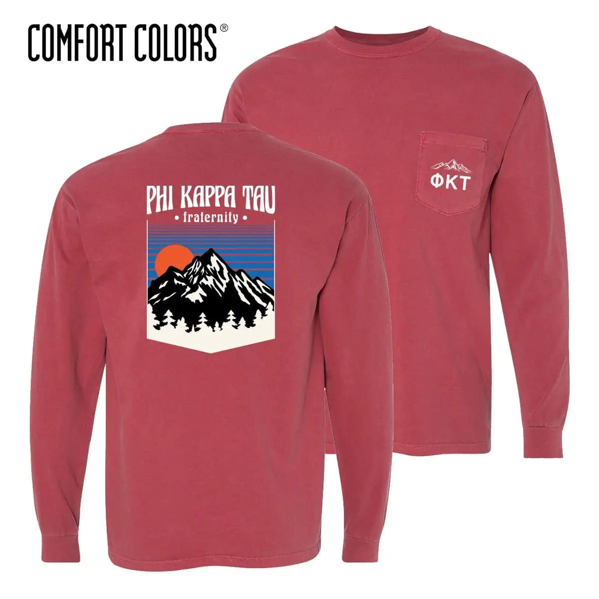 This 100% pre-shrunk ring spun cotton tee is the perfect everyday tee! Phi Kappa Tau is written on the back in a fun retro font above a classic mountain design. While the front pocket is decorated with Phi Tau's greek letters and a matching mountain outline. Represent your greek letters with style!