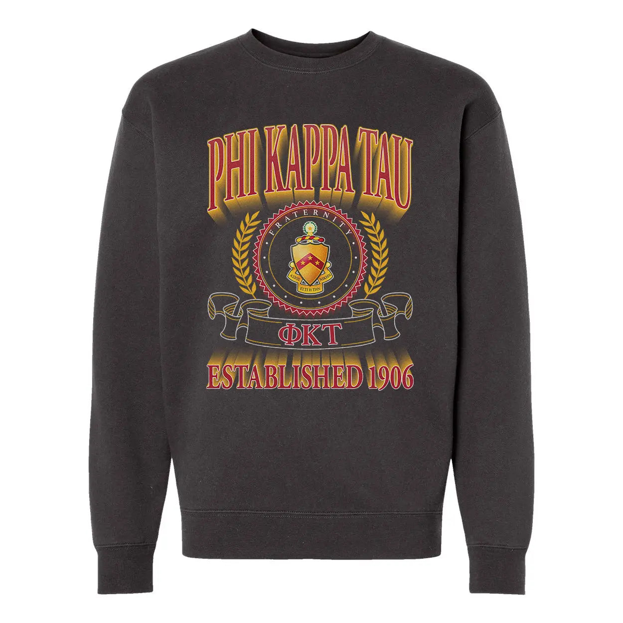 Make a bold statement with the Phi Tau Heavyweight Graphic Crewneck, inspired by classic large-print athletic apparel. Crafted from a durable 10 oz cotton-poly blend, this sweatshirt delivers a true heavyweight feel that is thick, warm, and built to last. The front features bold Phi Kappa Tau lettering tied into a vintage collegiate design that stands out. With its sturdy construction and soft interior, this crewneck is perfect for showcasing fraternity pride in comfort and style.