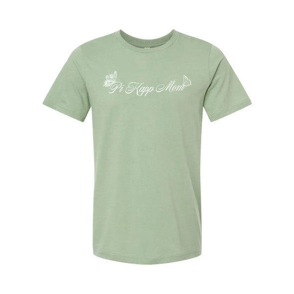Show your mom some love with a new t-shirt! This sage green tee features "Pi Kapp Mom" surrounded by delicate butterflies. Your mom is proud of her Pi Kappa Phi, let her show the world in this new fraternity mom t-shirt.