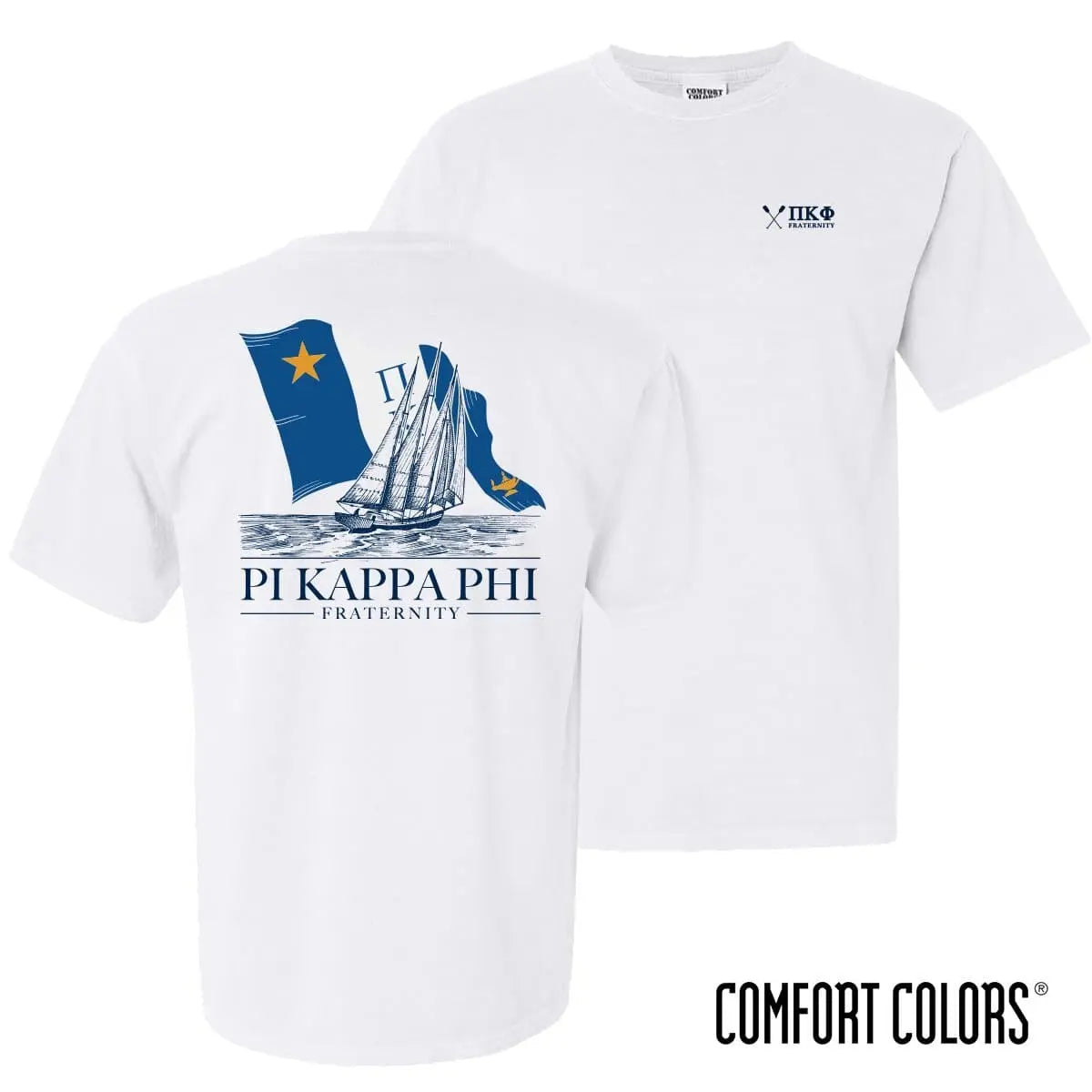 Come sail away in our Comfort Colors Pi Kapp seafarer tee! With the relaxed fit of the 100% pre-shrunk ringspun cotton tee and decorated with the Pi Kappa Phi flag, this tee will help you relax and kick back in style.