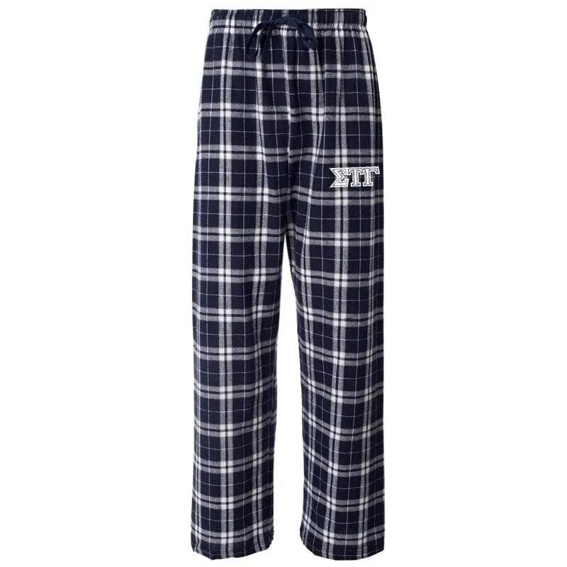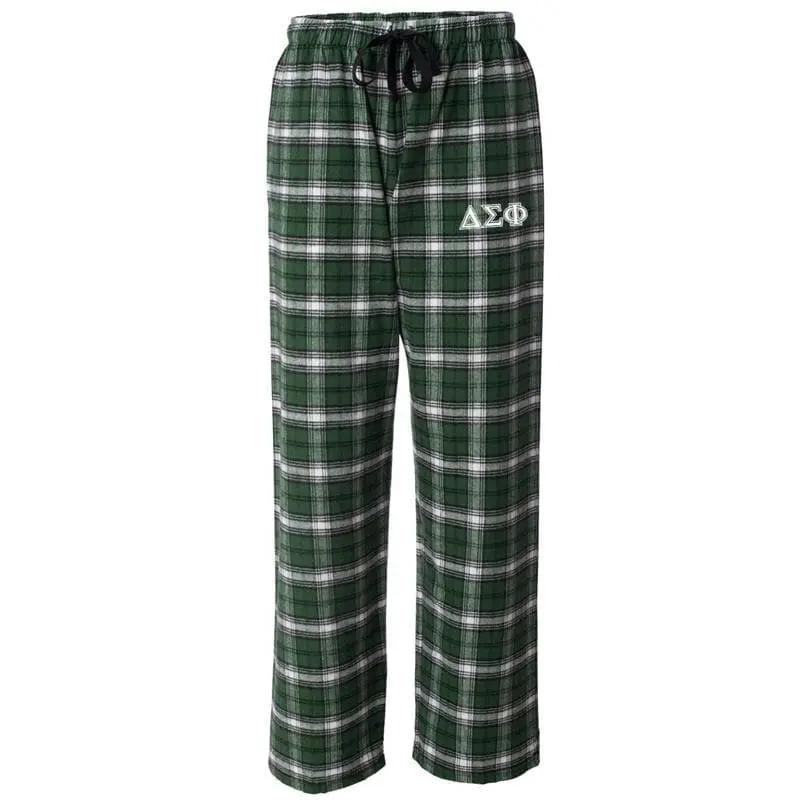 Whether it's a long night of studying or just watching a movie with Brothers, you know you'll be comfortable in these plaid flannel pants. Featuring a covered elastic drawstring waist, roomy fit, and your Greek letters imprinted on the left leg, these pants are made for relaxation! 100% brushed cotton flannel.