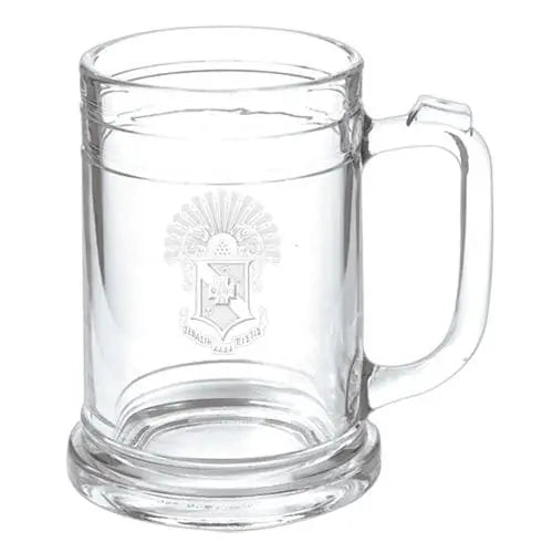 16 oz. keepsake glass mug with your fraternity coat of arms laser engraved design. Every brother should be holding one of these in the photograph. Then put the mug on the shelf right next to the framed pic!