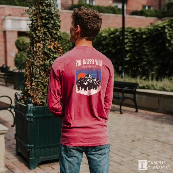 This 100% pre-shrunk ring spun cotton tee is the perfect everyday tee! Sigma Phi Epsilon is written on the back in a fun retro font above a classic mountain design. While the front pocket is decorated with Sig Ep's greek letters and a matching mountain outline. Represent your greek letters with style!