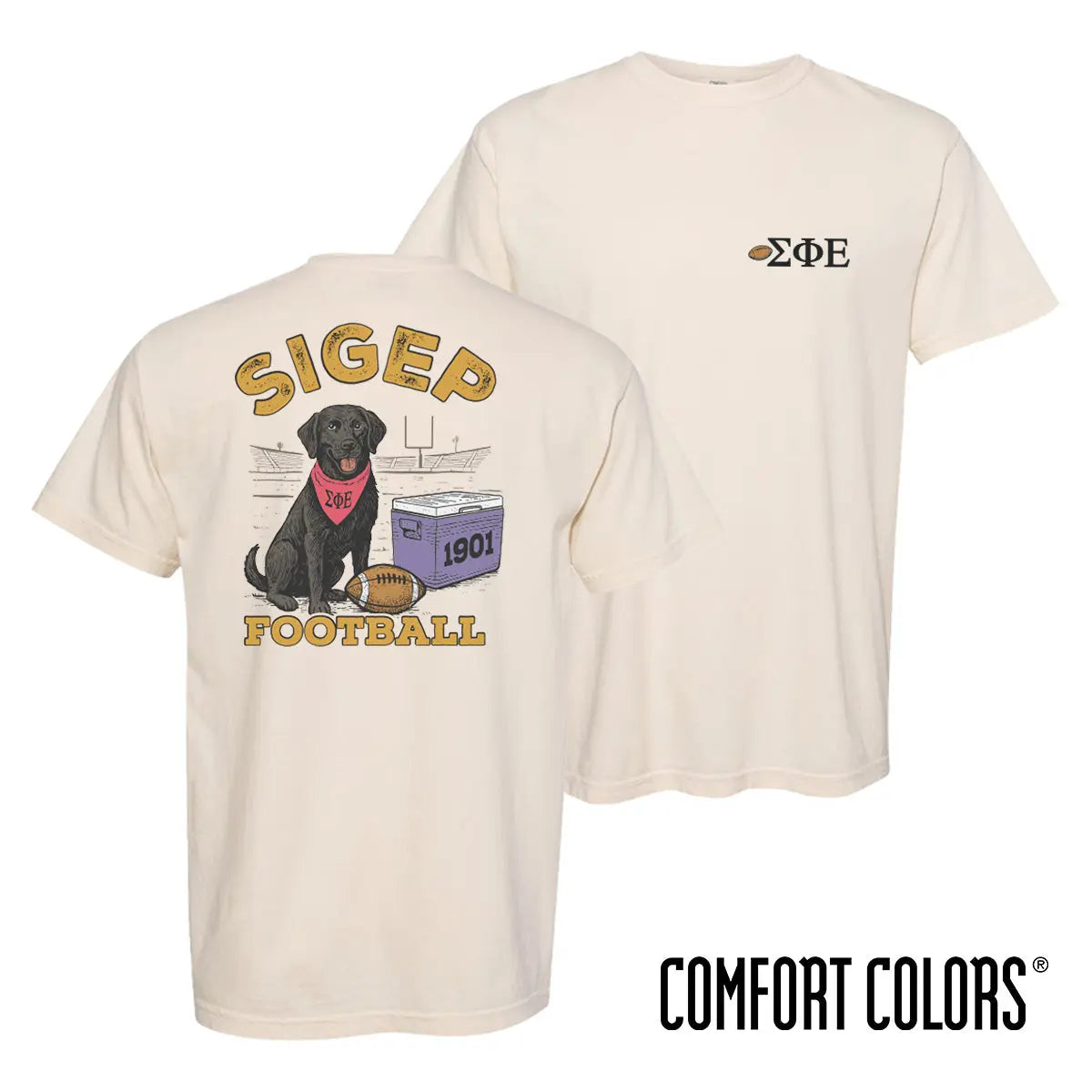 The Linebacker Lab Short Sleeve Tee is a playful nod to tradition, tailor-made for SigEp. Front and center, a game-day-ready black lab decked out in a Sigma Phi Epsilon bandana sits proudly in front of the goalposts, guarding a classic cooler stamped with your founding year and a well-worn football by its side. The hand-drawn artwork brings a nostalgic, vintage-inspired feel, capturing the energy of fall Saturdays and brotherhood pride. Whether you're repping your fraternity on campus, at homecoming, or just around town, this tee brings together timeless style and fraternity spirit in one standout piece.