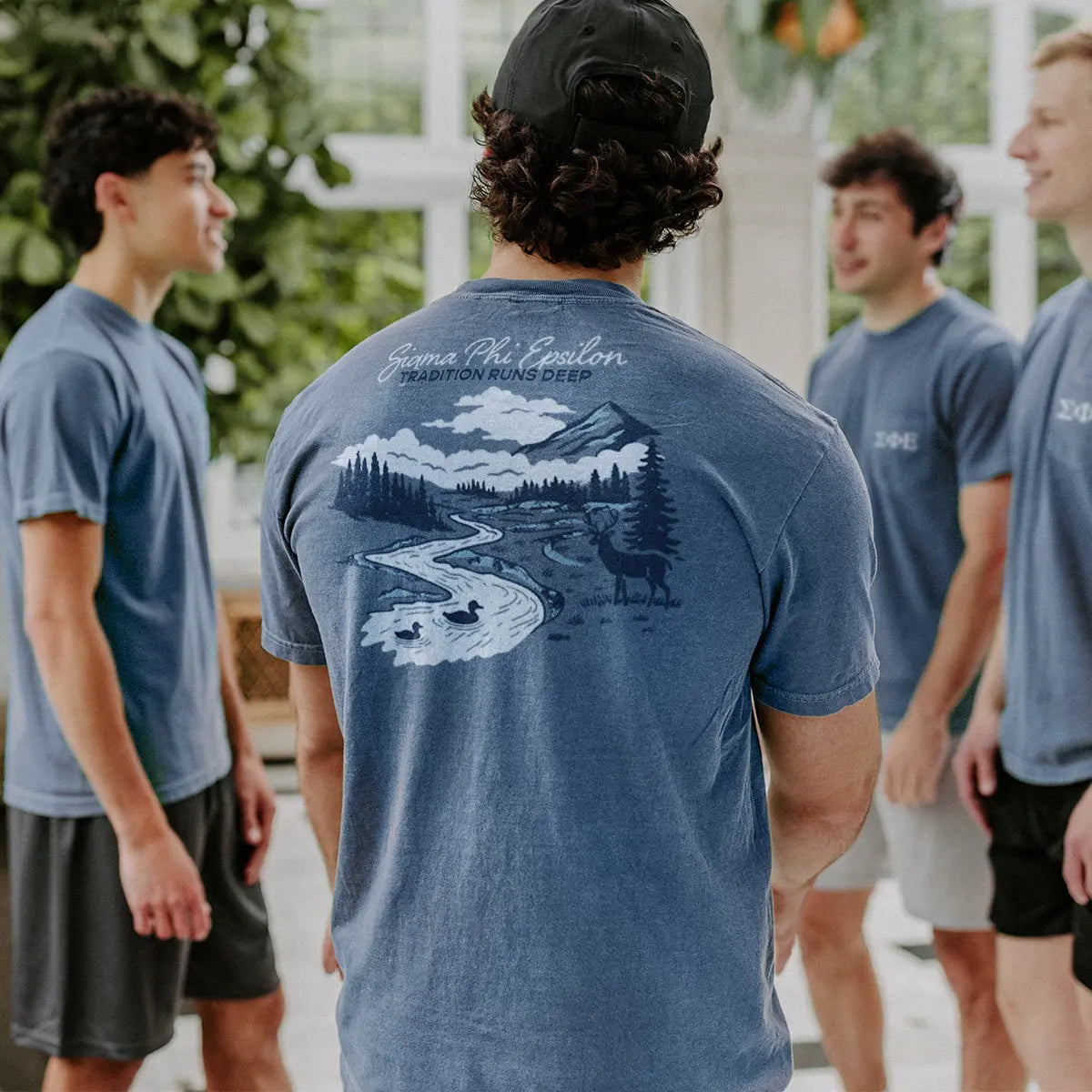 Show your pride with the SigEp Comfort Colors Tradition Runs Deep Short Sleeve Tee. This high-quality fraternity T-shirt features a stunning outdoor-themed back graphic complete with a winding river, mountains, and forest landscape, symbolizing the deep-rooted values and enduring brotherhood.