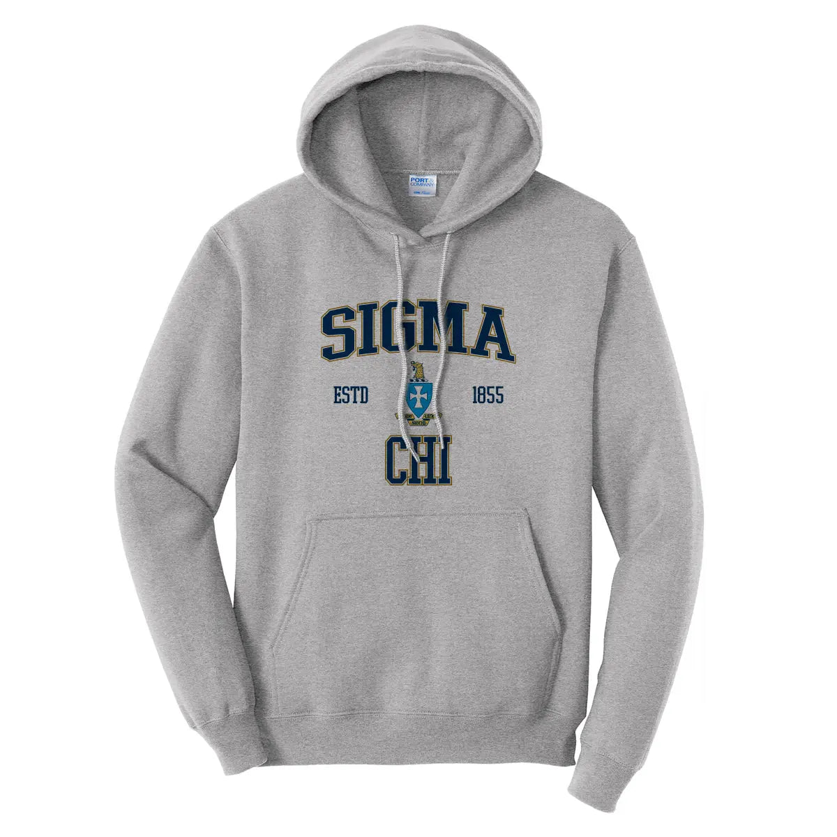 Sigma Chi is a classic and this hoodie with their crest and colors will be also. Sigma Chi, their crest, and established date is printed on the front of this 50/50 cotton/poly mid-weight hoodie.