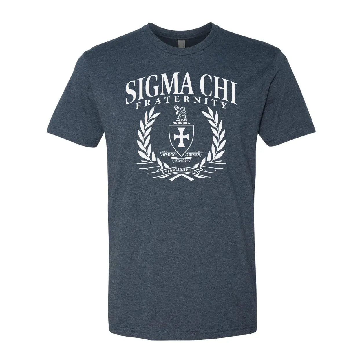 This Sigma Chi tee blends a classic collegiate design with modern comfort. Printed on a premium cotton-poly blend tee, it features Sigma Chi's official crest framed by bold typography and traditional laurel elements. The fabric is ultra-soft and breathable with a modern, athletic fit. Whether you're headed to a chapter event or just hanging out, this tee is an easy go-to.