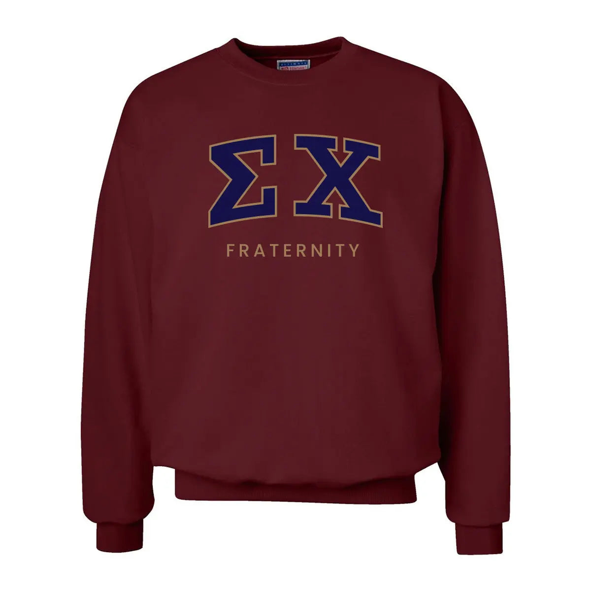 Rep your fraternity in vintage style with the new Sigma Chi Maroon Old School Crewneck. This super soft crewneck sweater celebrates your brotherhood's long history with a retro design all Sigma Chis will love. Prominently featuring your fraternity's Greek letters in collegiate navy and old gold on the front and the traditional maroon color of the crewneck give off an old school vibe, perfect for undergrads and alumni alike.