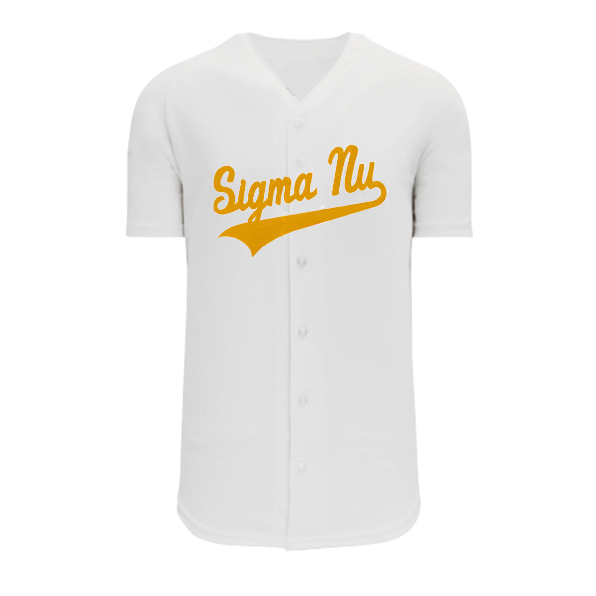 This Sigma Nu baseball jersey is perfect for intramurals, opening day, or any day! This jersey has a true baseball fit and features Sigma Nu in a classic tail design twill. It has a 6 button front with durable, mesh, 100% polyester fabric.