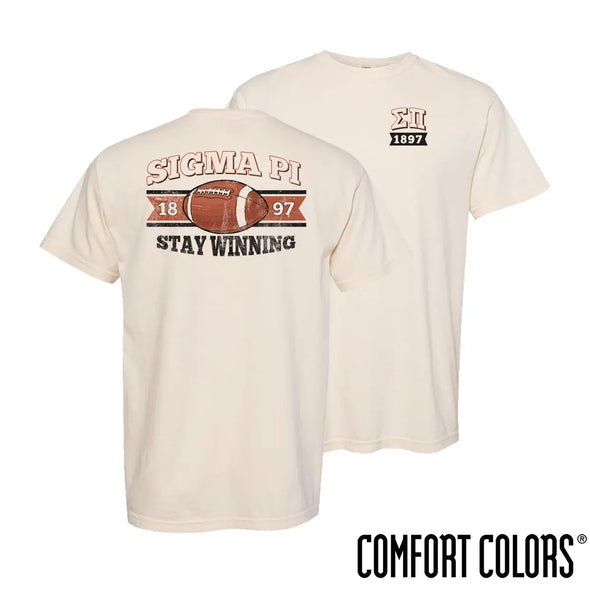 Get ready for game day in style. This Sigma Pi Comfort Colors Stay Winning Football Short Sleeve Tee is the perfect addition to your football season wardrobe. Printed on your favorit Comfort Colors tee, this ivory tee shows off the the Sigma Pi 'Stay Winning' attitude.