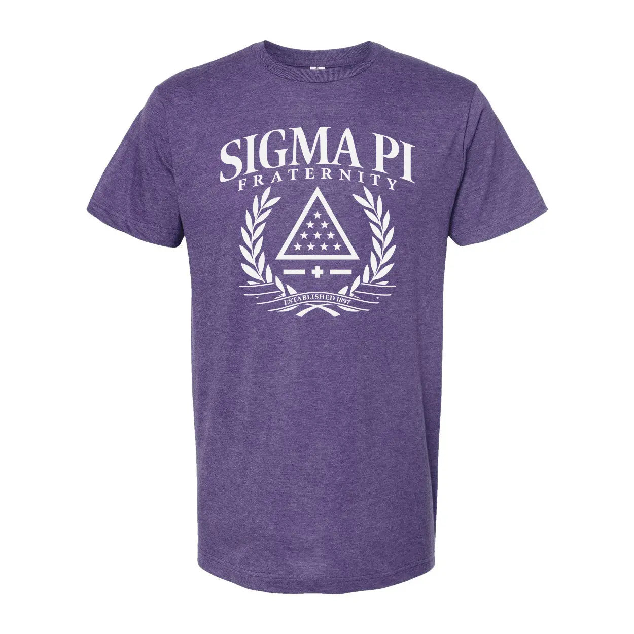 This Sigma Pi tee blends a classic collegiate design with modern comfort. Printed on a premium cotton-poly blend tee, it features Sigma Pi's official icon framed by bold typography and traditional laurel elements. The fabric is ultra-soft and breathable with a modern, athletic fit. Whether you're headed to a chapter event or just hanging out, this tee is an easy go-to.